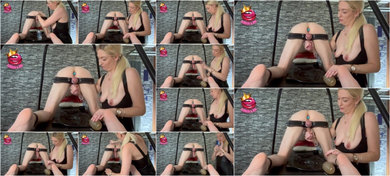 Sub Is Restrained On All Fours, Balls In Humbler And His Cock Is Milked
